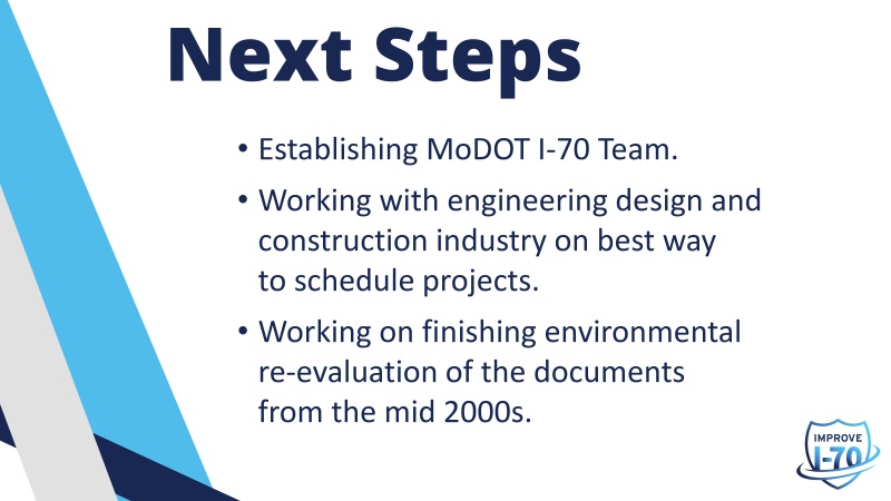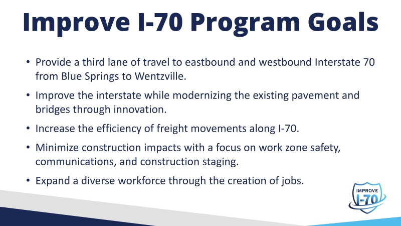 The Missouri Department of Transportation invited the public to attend seven informational kick-off meetings along the I-70 corridor to learn about the proposed plan and next steps for I-70 through August 28 and September 7, 2023. The information that was presented is available below. The online comment form that was available on this webpage closed on Friday, Sept. 22, 2023. Thank you to all who provided feedback.