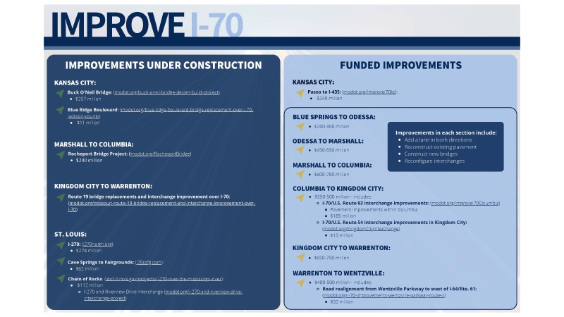 Public hearings for Improve I-70: Blue Springs to Odessa were held where project plans, traffic control, and schedule were shared shared.