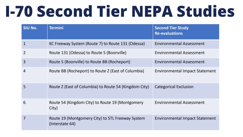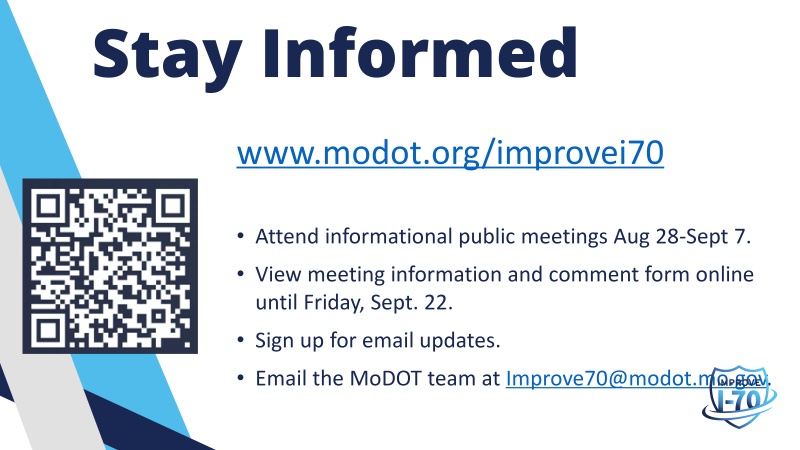 In Fall 2023, the Missouri Department of Transportation invited the public to attend seven informational kick-off meetings along the I-70 corridor to learn about the proposed plan and next steps for I-70.