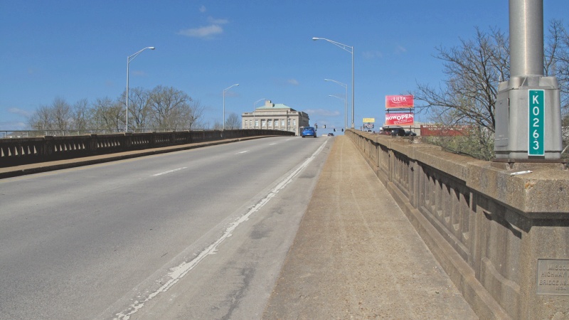 The Poplar Bluff Viaduct (Bridge K0263) is a 1934 deck truss (129’) with seven steel stringer approach spans. The steel stringer spans include four 37’ spans, and one 38’, 39’ and 41’ span. The deck truss is a six-panel warren web truss. The bridge has a 45’ wide concrete deck, with a 32’ roadway and sidewalks cantilevered on both sides. There are concrete baluster railings on the edges of the sidewalks.