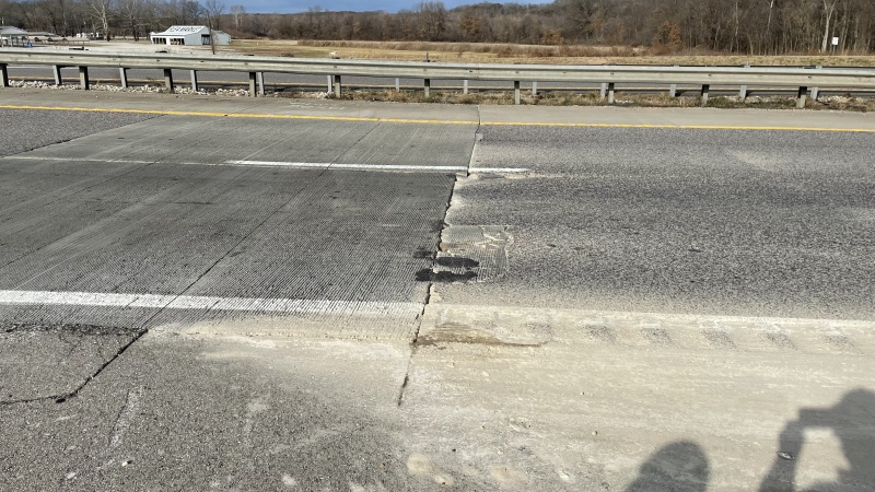 Aging pavement along I-44 at the U.S. 50 interchange requires ongoing repairs to maintain drivable conditions, especially under heavy traffic.