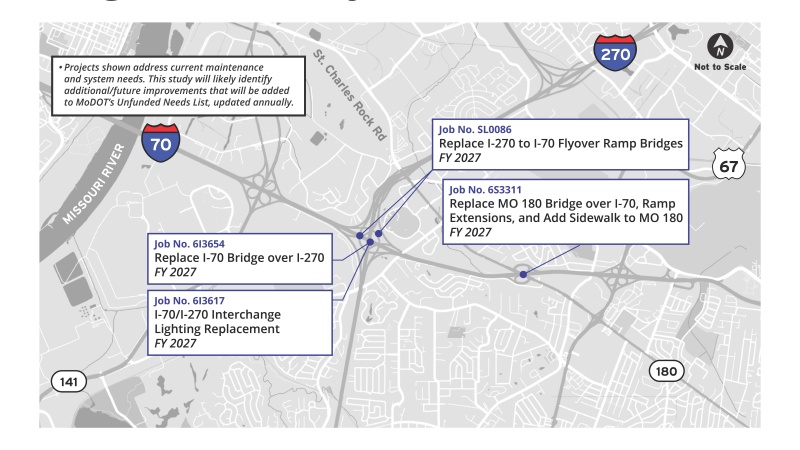- MoDOT has identified partial funding for the potential needs in Segment 1 (FY2029) beyond the in-kind replacement of the designated I-70 bridge locations (I-270 interchange & MO 180 [St Charles Rock Road] over I-70).