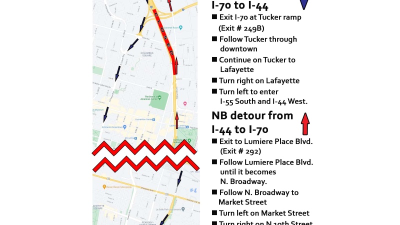 Those heading into downtown, especially during morning and evening rush, may want to consider using the Tucker or Broadway ramps to get into the city to avoid the most congestion. Drivers may also want to consider using I-170 to I-64 and enter the city that way. Drivers heading to Illinois should consider using I-64 or the Stan Musial Veterans Memorial Bridge on I-70 to cross the river.