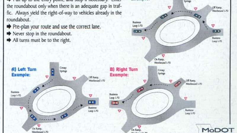 A roundabout is basically a large circle in the middle of an intersection. A roundabout replaces a traffic signal. Vehicles move in a counter-clockwise direction through the intersection and all entering traffic yields to the traffic already in the circle. If there is no traffic in the circle you do not have to stop, therefore reducing your delay time. Accidents are generally decreased because conflict points are minimized (i.e. no left turns) and speed is lower compared to signalized intersections. Roundabouts also handle a greater volume of traffic than a conventional signalized intersection.