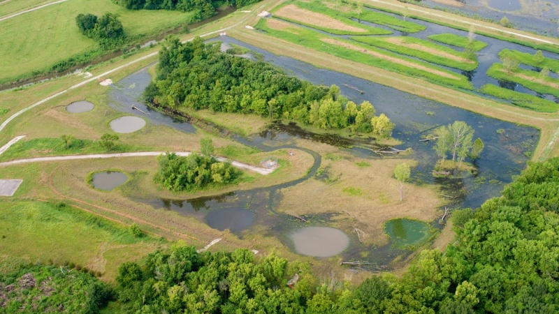 Blue Springs Bank consists of four cells containing 24 acres of emergent, scrub/shrub, and forested wetland habitat. Some enhancements of existing wetland features at the site were also made. The hydrology of the cells can be manipulated through the use of water inflow from the lake through piping; this allows for greater management of water in and through the system to better achieve targeted restoration goals. This site is accessible to the public for bird and wildlife observation.